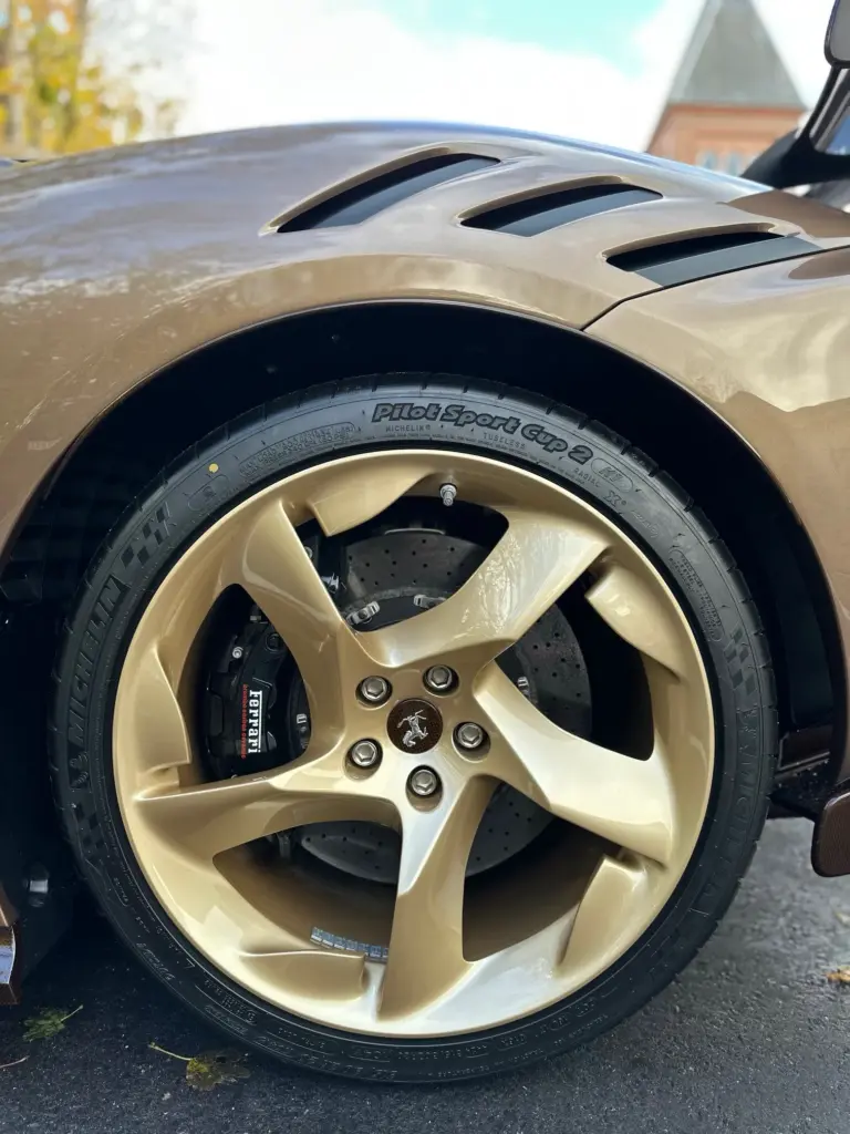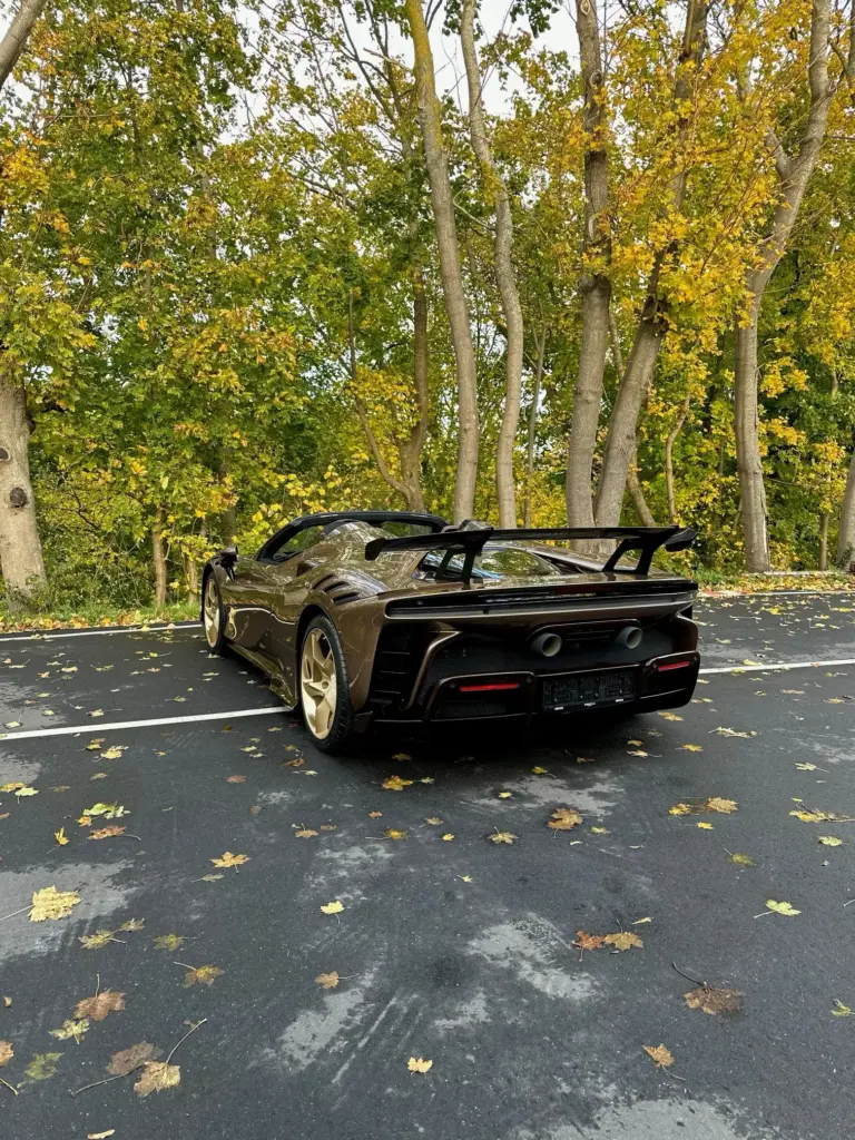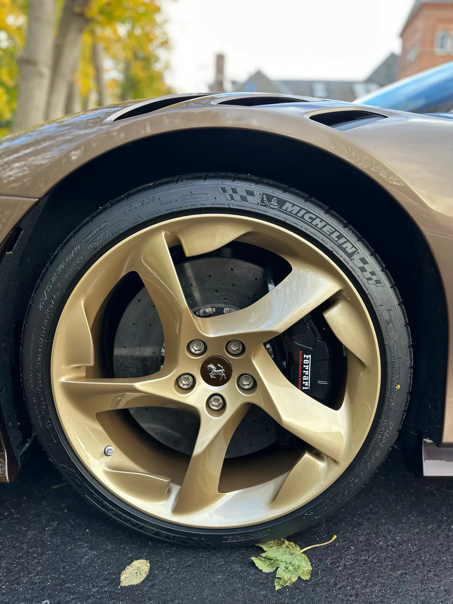 The car is loaded with Speciale carbon fibre exterior components — including front spoilers, rear diffuser, rear spoiler, side air splitters, engine covers, boot trims and sill covers — all executed in rare and refined finishes such as Carbonio Marrone Lucido. Unique airbrushed Scuderia Ferrari shields and Rubino Micalizzato bicolour painted wheels (with optional Oro Chiaro glossy finish) complete this commission, paired with black brake calipers and matte black exhaust tips.