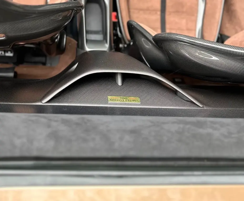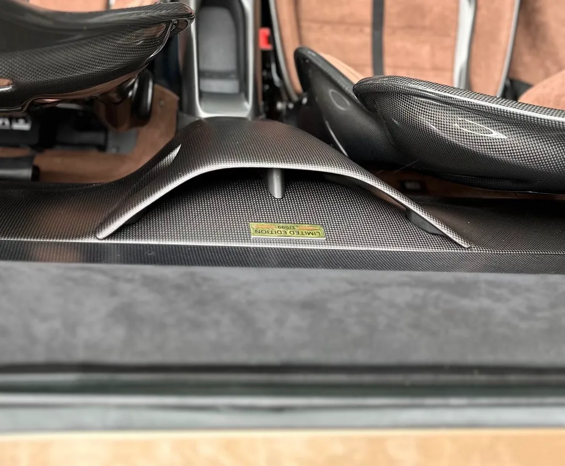 The cabin integrates Alcantara Nera handgrip steering wheel, cockpit inserts, and inner details, blending seamlessly with exclusive carbon fibre elements — from the instrument cluster zone to the rear wall and upper tunnel. Every surface speaks to lightweight precision and bespoke luxury.